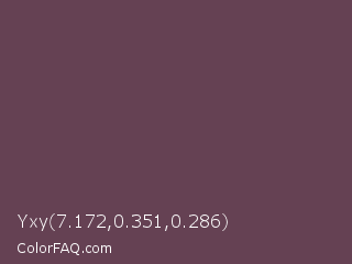 Yxy 7.172,0.351,0.286 Color is a normal rose color and the nearest color is Eggplant #614051. Hex code #654153 and RGB value is rgb(101,65,83). In RGB color space, this color is composed of 40% red, 25% green, 33% blue, In CMYK color space, this color is composed of 0% cyan, 36% magenta, 18% yellow , 60% black , In HSL color space, this color has a hue angle of 330° , 22% saturation and 33% lightness.
