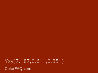 Yxy 7.187,0.611,0.351 Color is a dark red color and the nearest color is Totem Pole #991b07. Hex code #931f02 and RGB value is rgb(147,31,2). In RGB color space, this color is composed of 58% red, 12% green, 1% blue, In CMYK color space, this color is composed of 0% cyan, 79% magenta, 99% yellow , 42% black , In HSL color space, this color has a hue angle of 12° , 97% saturation and 29% lightness.