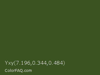 Yxy 7.196,0.344,0.484 Color is a dark green color and the nearest color is Army Green #4b5320. Hex code #3a5321 and RGB value is rgb(58,83,33). In RGB color space, this color is composed of 23% red, 33% green, 13% blue, In CMYK color space, this color is composed of 30% cyan, 0% magenta, 60% yellow , 67% black , In HSL color space, this color has a hue angle of 90° , 43% saturation and 23% lightness.