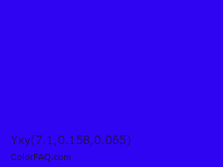 Yxy 7.1,0.158,0.065 Color is a normal indigo color and the nearest color is Electric Ultramarine #3f00ff. Hex code #2e04f3 and RGB value is rgb(46,4,243). In RGB color space, this color is composed of 18% red, 2% green, 95% blue, In CMYK color space, this color is composed of 81% cyan, 98% magenta, 0% yellow , 5% black , In HSL color space, this color has a hue angle of 251° , 97% saturation and 48% lightness.