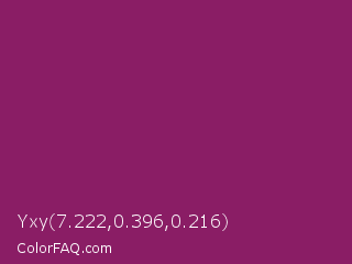 Yxy 7.222,0.396,0.216 Color is a normal magenta color and the nearest color is Dark Raspberry #872657. Hex code #8a1d65 and RGB value is rgb(138,29,101). In RGB color space, this color is composed of 54% red, 11% green, 40% blue, In CMYK color space, this color is composed of 0% cyan, 79% magenta, 27% yellow , 46% black , In HSL color space, this color has a hue angle of 320° , 65% saturation and 33% lightness.