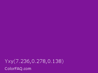 Yxy 7.236,0.278,0.138 Color is a normal purple color and the nearest color is Seance #731e8f. Hex code #7e1499 and RGB value is rgb(126,20,153). In RGB color space, this color is composed of 49% red, 8% green, 60% blue, In CMYK color space, this color is composed of 18% cyan, 87% magenta, 0% yellow , 40% black , In HSL color space, this color has a hue angle of 288° , 77% saturation and 34% lightness.