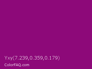 Yxy 7.239,0.359,0.179 Color is a dark magenta color and the nearest color is Mardi Gras #880085. Hex code #8d0979 and RGB value is rgb(141,9,121). In RGB color space, this color is composed of 55% red, 4% green, 47% blue, In CMYK color space, this color is composed of 0% cyan, 94% magenta, 14% yellow , 45% black , In HSL color space, this color has a hue angle of 309° , 88% saturation and 29% lightness.