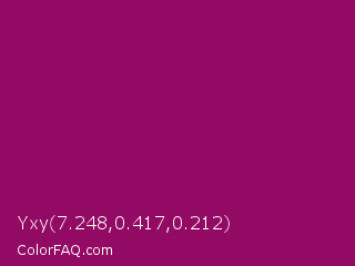 Yxy 7.248,0.417,0.212 Color is a normal magenta color and the nearest color is Cardinal Pink #8c055e. Hex code #920a64 and RGB value is rgb(146,10,100). In RGB color space, this color is composed of 57% red, 4% green, 39% blue, In CMYK color space, this color is composed of 0% cyan, 93% magenta, 32% yellow , 43% black , In HSL color space, this color has a hue angle of 320° , 87% saturation and 31% lightness.