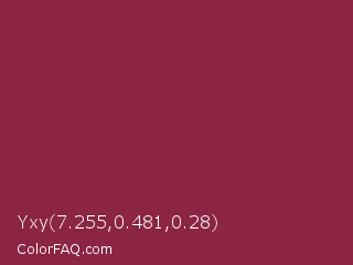 Yxy 7.255,0.481,0.28 Color is a normal rose color and the nearest color is Big Dip O Ruby #9c2542. Hex code #8c2444 and RGB value is rgb(140,36,68). In RGB color space, this color is composed of 55% red, 14% green, 27% blue, In CMYK color space, this color is composed of 0% cyan, 74% magenta, 51% yellow , 45% black , In HSL color space, this color has a hue angle of 342° , 59% saturation and 35% lightness.