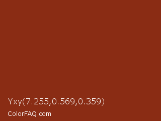 Yxy 7.255,0.569,0.359 Color is a normal red color and the nearest color is Kobe #882d17. Hex code #8a2c14 and RGB value is rgb(138,44,20). In RGB color space, this color is composed of 54% red, 17% green, 8% blue, In CMYK color space, this color is composed of 0% cyan, 68% magenta, 86% yellow , 46% black , In HSL color space, this color has a hue angle of 12° , 75% saturation and 31% lightness.