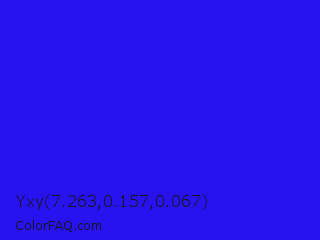 Yxy 7.263,0.157,0.067 Color is a normal indigo color and the nearest color is Bluebonnet #1c1cf0. Hex code #2712f2 and RGB value is rgb(39,18,242). In RGB color space, this color is composed of 15% red, 7% green, 95% blue, In CMYK color space, this color is composed of 84% cyan, 93% magenta, 0% yellow , 5% black , In HSL color space, this color has a hue angle of 246° , 90% saturation and 51% lightness.