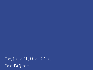 Yxy 7.271,0.2,0.17 Color is a normal blue color and the nearest color is Chambray #354e8c. Hex code #31488f and RGB value is rgb(49,72,143). In RGB color space, this color is composed of 19% red, 28% green, 56% blue, In CMYK color space, this color is composed of 66% cyan, 50% magenta, 0% yellow , 44% black , In HSL color space, this color has a hue angle of 225° , 49% saturation and 38% lightness.