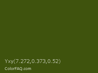 Yxy 7.272,0.373,0.52 Color is a very dark lime color and the nearest color is Clover #384910. Hex code #3f530d and RGB value is rgb(63,83,13). In RGB color space, this color is composed of 25% red, 33% green, 5% blue, In CMYK color space, this color is composed of 24% cyan, 0% magenta, 84% yellow , 67% black , In HSL color space, this color has a hue angle of 77° , 73% saturation and 19% lightness.