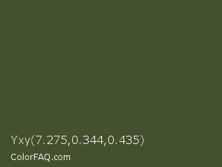 Yxy 7.275,0.344,0.435 Color is a dark green color and the nearest color is Rifle Green #444c38. Hex code #43512e and RGB value is rgb(67,81,46). In RGB color space, this color is composed of 26% red, 32% green, 18% blue, In CMYK color space, this color is composed of 17% cyan, 0% magenta, 43% yellow , 68% black , In HSL color space, this color has a hue angle of 84° , 28% saturation and 25% lightness.
