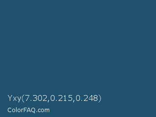 Yxy 7.302,0.215,0.248 Color is a dark blue color and the nearest color is Chathams Blue #175579. Hex code #1f516e and RGB value is rgb(31,81,110). In RGB color space, this color is composed of 12% red, 32% green, 43% blue, In CMYK color space, this color is composed of 72% cyan, 26% magenta, 0% yellow , 57% black , In HSL color space, this color has a hue angle of 202° , 56% saturation and 28% lightness.