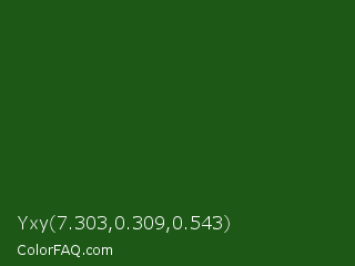 Yxy 7.303,0.309,0.543 Color is a very dark green color and the nearest color is Green House #24500f. Hex code #1d5817 and RGB value is rgb(29,88,23). In RGB color space, this color is composed of 11% red, 35% green, 9% blue, In CMYK color space, this color is composed of 67% cyan, 0% magenta, 74% yellow , 65% black , In HSL color space, this color has a hue angle of 114° , 59% saturation and 22% lightness.