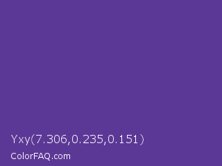 Yxy 7.306,0.235,0.151 Color is a normal violet color and the nearest color is Blue Magenta Violet #553592. Hex code #5c3896 and RGB value is rgb(92,56,150). In RGB color space, this color is composed of 36% red, 22% green, 59% blue, In CMYK color space, this color is composed of 39% cyan, 63% magenta, 0% yellow , 41% black , In HSL color space, this color has a hue angle of 263° , 46% saturation and 40% lightness.