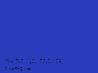 Yxy 7.314,0.172,0.109 Color is a normal blue color and the nearest color is Denim Blue #2243b6. Hex code #283cbc and RGB value is rgb(40,60,188). In RGB color space, this color is composed of 16% red, 24% green, 74% blue, In CMYK color space, this color is composed of 79% cyan, 68% magenta, 0% yellow , 26% black , In HSL color space, this color has a hue angle of 232° , 65% saturation and 45% lightness.