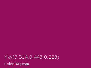 Yxy 7.314,0.443,0.228 Color is a normal magenta color and the nearest color is Cardinal Pink #8c055e. Hex code #940d5b and RGB value is rgb(148,13,91). In RGB color space, this color is composed of 58% red, 5% green, 36% blue, In CMYK color space, this color is composed of 0% cyan, 91% magenta, 39% yellow , 42% black , In HSL color space, this color has a hue angle of 325° , 84% saturation and 32% lightness.