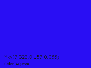 Yxy 7.323,0.157,0.066 Color is a normal indigo color and the nearest color is Bluebonnet #1c1cf0. Hex code #290ef4 and RGB value is rgb(41,14,244). In RGB color space, this color is composed of 16% red, 5% green, 96% blue, In CMYK color space, this color is composed of 83% cyan, 94% magenta, 0% yellow , 4% black , In HSL color space, this color has a hue angle of 247° , 91% saturation and 51% lightness.