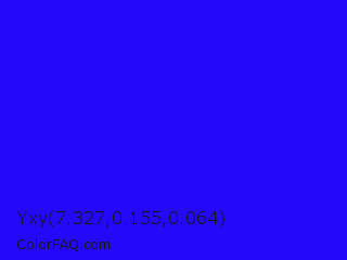 Yxy 7.327,0.155,0.064 Color is a normal indigo color and the nearest color is Bluebonnet #1c1cf0. Hex code #2309f8 and RGB value is rgb(35,9,248). In RGB color space, this color is composed of 14% red, 4% green, 97% blue, In CMYK color space, this color is composed of 86% cyan, 96% magenta, 0% yellow , 3% black , In HSL color space, this color has a hue angle of 247° , 94% saturation and 50% lightness.