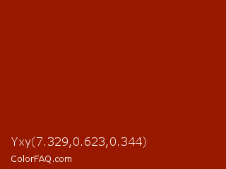 Yxy 7.329,0.623,0.344 Color is a dark red color and the nearest color is Totem Pole #991b07. Hex code #981800 and RGB value is rgb(152,24,0). In RGB color space, this color is composed of 60% red, 9% green, 0% blue, In CMYK color space, this color is composed of 0% cyan, 84% magenta, 100% yellow , 40% black , In HSL color space, this color has a hue angle of 9° , 100% saturation and 30% lightness.