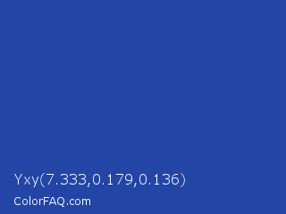 Yxy 7.333,0.179,0.136 Color is a normal blue color and the nearest color is Denim Blue #2243b6. Hex code #2245a6 and RGB value is rgb(34,69,166). In RGB color space, this color is composed of 13% red, 27% green, 65% blue, In CMYK color space, this color is composed of 80% cyan, 58% magenta, 0% yellow , 35% black , In HSL color space, this color has a hue angle of 224° , 66% saturation and 39% lightness.