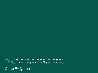 Yxy 7.343,0.239,0.373 Color is a very dark cyan color and the nearest color is Evening Sea #024e46. Hex code #05574a and RGB value is rgb(5,87,74). In RGB color space, this color is composed of 2% red, 34% green, 29% blue, In CMYK color space, this color is composed of 94% cyan, 0% magenta, 15% yellow , 66% black , In HSL color space, this color has a hue angle of 170° , 89% saturation and 18% lightness.