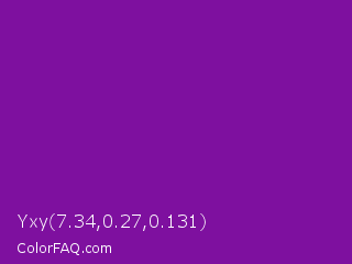 Yxy 7.34,0.27,0.131 Color is a normal purple color and the nearest color is Violet RYB #8601af. Hex code #7e109f and RGB value is rgb(126,16,159). In RGB color space, this color is composed of 49% red, 6% green, 62% blue, In CMYK color space, this color is composed of 21% cyan, 90% magenta, 0% yellow , 38% black , In HSL color space, this color has a hue angle of 286° , 82% saturation and 34% lightness.