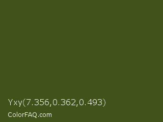 Yxy 7.356,0.362,0.493 Color is a very dark green color and the nearest color is Army Green #4b5320. Hex code #40531b and RGB value is rgb(64,83,27). In RGB color space, this color is composed of 25% red, 33% green, 11% blue, In CMYK color space, this color is composed of 23% cyan, 0% magenta, 67% yellow , 67% black , In HSL color space, this color has a hue angle of 80° , 51% saturation and 22% lightness.
