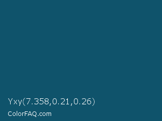Yxy 7.358,0.21,0.26 Color is a dark blue color and the nearest color is Chathams Blue #175579. Hex code #0f536b and RGB value is rgb(15,83,107). In RGB color space, this color is composed of 6% red, 33% green, 42% blue, In CMYK color space, this color is composed of 86% cyan, 22% magenta, 0% yellow , 58% black , In HSL color space, this color has a hue angle of 196° , 75% saturation and 24% lightness.