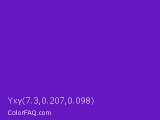 Yxy 7.3,0.207,0.098 Color is a normal violet color and the nearest color is Purple Heart Crayola #652dc1. Hex code #6518c2 and RGB value is rgb(101,24,194). In RGB color space, this color is composed of 40% red, 9% green, 76% blue, In CMYK color space, this color is composed of 48% cyan, 88% magenta, 0% yellow , 24% black , In HSL color space, this color has a hue angle of 267° , 78% saturation and 43% lightness.