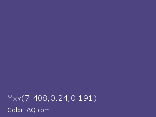 Yxy 7.408,0.24,0.191 Color is a normal indigo color and the nearest color is Cyber Grape #58427c. Hex code #4f4482 and RGB value is rgb(79,68,130). In RGB color space, this color is composed of 31% red, 27% green, 51% blue, In CMYK color space, this color is composed of 39% cyan, 48% magenta, 0% yellow , 49% black , In HSL color space, this color has a hue angle of 251° , 31% saturation and 39% lightness.