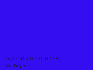 Yxy 7.412,0.161,0.068 Color is a normal indigo color and the nearest color is Electric Ultramarine #3f00ff. Hex code #350df1 and RGB value is rgb(53,13,241). In RGB color space, this color is composed of 21% red, 5% green, 95% blue, In CMYK color space, this color is composed of 78% cyan, 95% magenta, 0% yellow , 5% black , In HSL color space, this color has a hue angle of 251° , 90% saturation and 50% lightness.