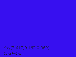 Yxy 7.417,0.162,0.069 Color is a normal indigo color and the nearest color is Electric Ultramarine #3f00ff. Hex code #370ff0 and RGB value is rgb(55,15,240). In RGB color space, this color is composed of 22% red, 6% green, 94% blue, In CMYK color space, this color is composed of 77% cyan, 94% magenta, 0% yellow , 6% black , In HSL color space, this color has a hue angle of 251° , 88% saturation and 50% lightness.