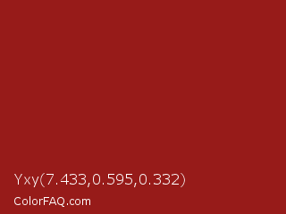 Yxy 7.433,0.595,0.332 Color is a normal red color and the nearest color is Tamarillo #991613. Hex code #971b19 and RGB value is rgb(151,27,25). In RGB color space, this color is composed of 59% red, 11% green, 10% blue, In CMYK color space, this color is composed of 0% cyan, 82% magenta, 83% yellow , 41% black , In HSL color space, this color has a hue angle of 1° , 72% saturation and 35% lightness.