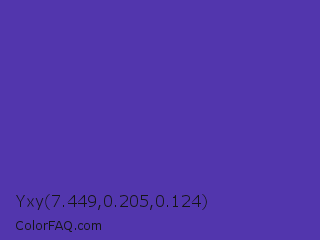 Yxy 7.449,0.205,0.124 Color is a normal indigo color and the nearest color is Ocean Blue #4f42b5. Hex code #5236ad and RGB value is rgb(82,54,173). In RGB color space, this color is composed of 32% red, 21% green, 68% blue, In CMYK color space, this color is composed of 53% cyan, 69% magenta, 0% yellow , 32% black , In HSL color space, this color has a hue angle of 254° , 52% saturation and 45% lightness.