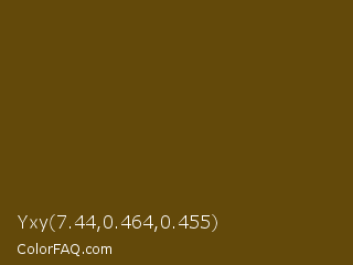 Yxy 7.44,0.464,0.455 Color is a very dark orange color and the nearest color is Horses Neck #604913. Hex code #63490a and RGB value is rgb(99,73,10). In RGB color space, this color is composed of 39% red, 29% green, 4% blue, In CMYK color space, this color is composed of 0% cyan, 26% magenta, 90% yellow , 61% black , In HSL color space, this color has a hue angle of 42° , 82% saturation and 21% lightness.