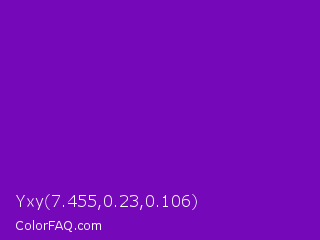 Yxy 7.455,0.23,0.106 Color is a normal purple color and the nearest color is Violet RYB #8601af. Hex code #7508b9 and RGB value is rgb(117,8,185). In RGB color space, this color is composed of 46% red, 3% green, 73% blue, In CMYK color space, this color is composed of 37% cyan, 96% magenta, 0% yellow , 27% black , In HSL color space, this color has a hue angle of 277° , 92% saturation and 38% lightness.