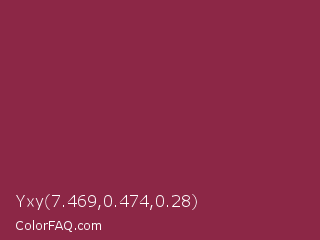Yxy 7.469,0.474,0.28 Color is a normal rose color and the nearest color is Big Dip O Ruby #9c2542. Hex code #8c2746 and RGB value is rgb(140,39,70). In RGB color space, this color is composed of 55% red, 15% green, 27% blue, In CMYK color space, this color is composed of 0% cyan, 72% magenta, 50% yellow , 45% black , In HSL color space, this color has a hue angle of 342° , 56% saturation and 35% lightness.
