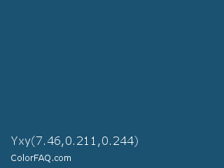 Yxy 7.46,0.211,0.244 Color is a dark blue color and the nearest color is Chathams Blue #175579. Hex code #1c5271 and RGB value is rgb(28,82,113). In RGB color space, this color is composed of 11% red, 32% green, 44% blue, In CMYK color space, this color is composed of 75% cyan, 27% magenta, 0% yellow , 56% black , In HSL color space, this color has a hue angle of 202° , 60% saturation and 28% lightness.
