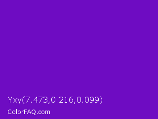 Yxy 7.473,0.216,0.099 Color is a normal purple color and the nearest color is French Violet #8806ce. Hex code #6e0cc2 and RGB value is rgb(110,12,194). In RGB color space, this color is composed of 43% red, 5% green, 76% blue, In CMYK color space, this color is composed of 43% cyan, 94% magenta, 0% yellow , 24% black , In HSL color space, this color has a hue angle of 272° , 88% saturation and 40% lightness.