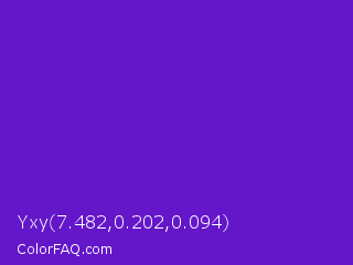 Yxy 7.482,0.202,0.094 Color is a normal violet color and the nearest color is Purple Heart Crayola #652dc1. Hex code #6416c9 and RGB value is rgb(100,22,201). In RGB color space, this color is composed of 39% red, 9% green, 79% blue, In CMYK color space, this color is composed of 50% cyan, 89% magenta, 0% yellow , 21% black , In HSL color space, this color has a hue angle of 266° , 80% saturation and 44% lightness.