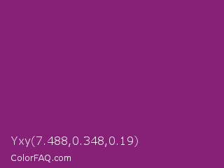 Yxy 7.488,0.348,0.19 Color is a normal magenta color and the nearest color is Razzmic Berry Crayola #843179. Hex code #862177 and RGB value is rgb(134,33,119). In RGB color space, this color is composed of 53% red, 13% green, 47% blue, In CMYK color space, this color is composed of 0% cyan, 75% magenta, 11% yellow , 47% black , In HSL color space, this color has a hue angle of 309° , 60% saturation and 33% lightness.