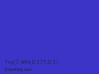 Yxy 7.494,0.177,0.1 Color is a normal indigo color and the nearest color is Governor Bay #2f3cb3. Hex code #3c34c6 and RGB value is rgb(60,52,198). In RGB color space, this color is composed of 24% red, 20% green, 78% blue, In CMYK color space, this color is composed of 70% cyan, 74% magenta, 0% yellow , 22% black , In HSL color space, this color has a hue angle of 243° , 58% saturation and 49% lightness.