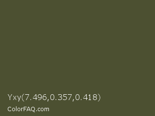 Yxy 7.496,0.357,0.418 Color is a dark yellow color and the nearest color is Woodland #4d5328. Hex code #4c5031 and RGB value is rgb(76,80,49). In RGB color space, this color is composed of 30% red, 31% green, 19% blue, In CMYK color space, this color is composed of 5% cyan, 0% magenta, 39% yellow , 69% black , In HSL color space, this color has a hue angle of 68° , 24% saturation and 25% lightness.