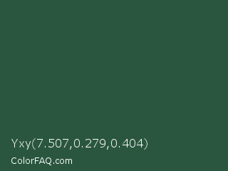 Yxy 7.507,0.279,0.404 Color is a dark green color and the nearest color is Plantation #27504b. Hex code #2a563f and RGB value is rgb(42,86,63). In RGB color space, this color is composed of 16% red, 34% green, 25% blue, In CMYK color space, this color is composed of 51% cyan, 0% magenta, 27% yellow , 66% black , In HSL color space, this color has a hue angle of 149° , 34% saturation and 25% lightness.