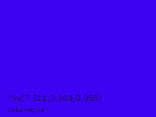 Yxy 7.511,0.164,0.068 Color is a normal indigo color and the nearest color is Electric Ultramarine #3f00ff. Hex code #3e02f2 and RGB value is rgb(62,2,242). In RGB color space, this color is composed of 24% red, 1% green, 95% blue, In CMYK color space, this color is composed of 74% cyan, 99% magenta, 0% yellow , 5% black , In HSL color space, this color has a hue angle of 255° , 98% saturation and 48% lightness.