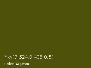 Yxy 7.524,0.408,0.5 Color is a very dark yellow color and the nearest color is Verdun Green #495400. Hex code #4e5109 and RGB value is rgb(78,81,9). In RGB color space, this color is composed of 31% red, 32% green, 4% blue, In CMYK color space, this color is composed of 4% cyan, 0% magenta, 89% yellow , 68% black , In HSL color space, this color has a hue angle of 63° , 80% saturation and 18% lightness.
