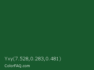 Yxy 7.528,0.283,0.481 Color is a very dark green color and the nearest color is Cal Poly Pomona Green #1e4d2b. Hex code #18592d and RGB value is rgb(24,89,45). In RGB color space, this color is composed of 9% red, 35% green, 18% blue, In CMYK color space, this color is composed of 73% cyan, 0% magenta, 49% yellow , 65% black , In HSL color space, this color has a hue angle of 139° , 58% saturation and 22% lightness.