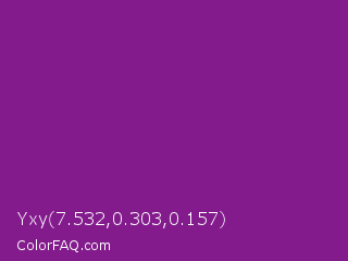 Yxy 7.532,0.303,0.157 Color is a normal magenta color and the nearest color is Seance #731e8f. Hex code #831b8d and RGB value is rgb(131,27,141). In RGB color space, this color is composed of 51% red, 11% green, 55% blue, In CMYK color space, this color is composed of 7% cyan, 81% magenta, 0% yellow , 45% black , In HSL color space, this color has a hue angle of 295° , 68% saturation and 33% lightness.