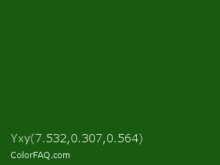 Yxy 7.532,0.307,0.564 Color is a very dark green color and the nearest color is Lincoln Green #195905. Hex code #175a10 and RGB value is rgb(23,90,16). In RGB color space, this color is composed of 9% red, 35% green, 6% blue, In CMYK color space, this color is composed of 74% cyan, 0% magenta, 82% yellow , 65% black , In HSL color space, this color has a hue angle of 114° , 70% saturation and 21% lightness.