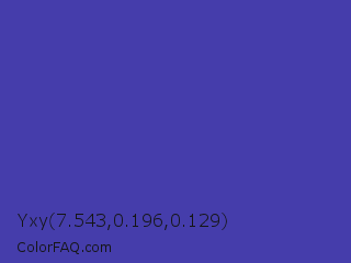 Yxy 7.543,0.196,0.129 Color is a normal indigo color and the nearest color is Ocean Blue #4f42b5. Hex code #453dab and RGB value is rgb(69,61,171). In RGB color space, this color is composed of 27% red, 24% green, 67% blue, In CMYK color space, this color is composed of 60% cyan, 64% magenta, 0% yellow , 33% black , In HSL color space, this color has a hue angle of 244° , 47% saturation and 45% lightness.