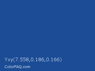 Yxy 7.558,0.186,0.166 Color is a normal blue color and the nearest color is Yale Blue #0f4d92. Hex code #1b4c95 and RGB value is rgb(27,76,149). In RGB color space, this color is composed of 11% red, 30% green, 58% blue, In CMYK color space, this color is composed of 82% cyan, 49% magenta, 0% yellow , 42% black , In HSL color space, this color has a hue angle of 216° , 69% saturation and 35% lightness.